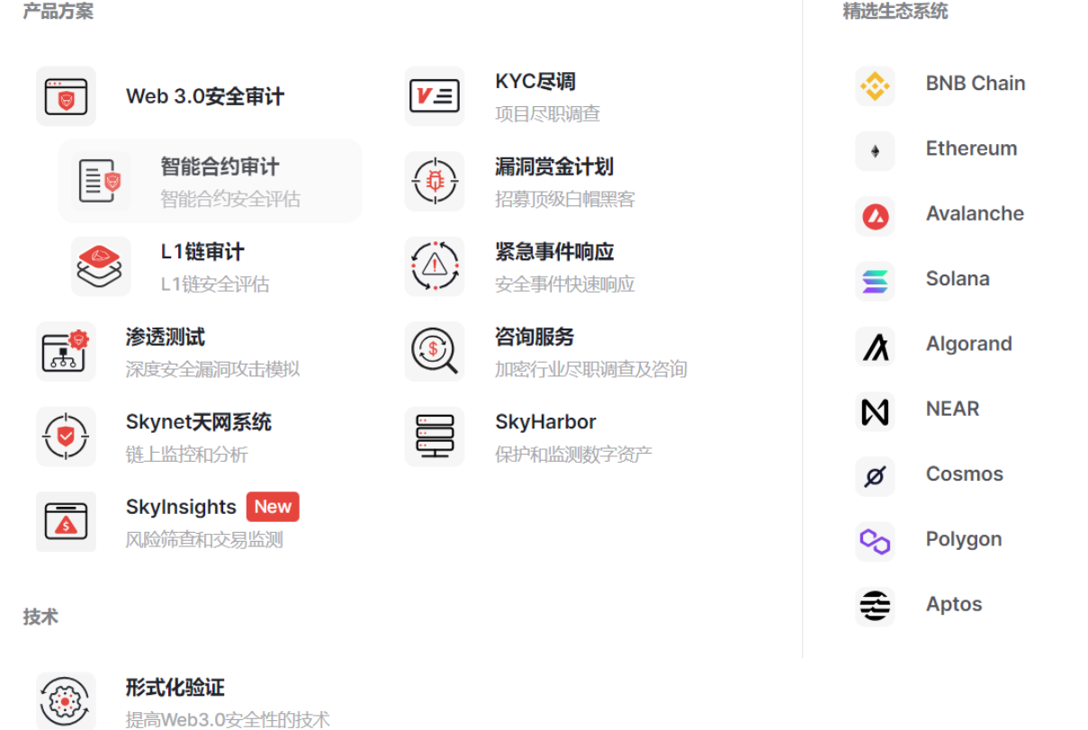 以 CertiK 为例,其为项目方和个人提供全流程的安全防护组件,包括Web3.0 安全审计和渗透测试,以发现和解决风险隐患;Skylnsights、KYC 尽调、紧急事件响应和漏洞赏金计划等措施,维护加密生态系统安全;以及 Skynet 天网系统和咨询服务等服务,搭建一体化的Web3安全分析平台,帮助使用者规避风险并提升安全风险意识。