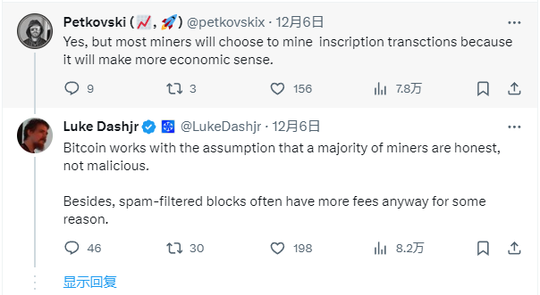 针对 Luke 的言论,有人指出,大多数矿工会选择开采铭文交易,因为这更具有经济意义。Luke 则回应道,比特币的运作假设是大多数矿工都是诚实的,没有恶意,且只追求短期利润的意识形态只是另一种意识形态,而且是一种糟糕的意识形态。