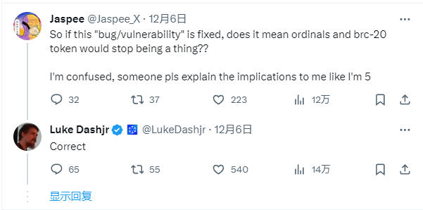 一石激起千层浪,人们因 Luke 的言论而争执不休。当然,吃瓜群众最关心的自然是铭文是否还能存在的问题,有用户询问道:“我很困惑,请把我当五岁小孩一样解释给我听:如果这个‘错误/漏洞’得到修复,是否意味着铭文和 BRC-20 代币将不再存在?”
