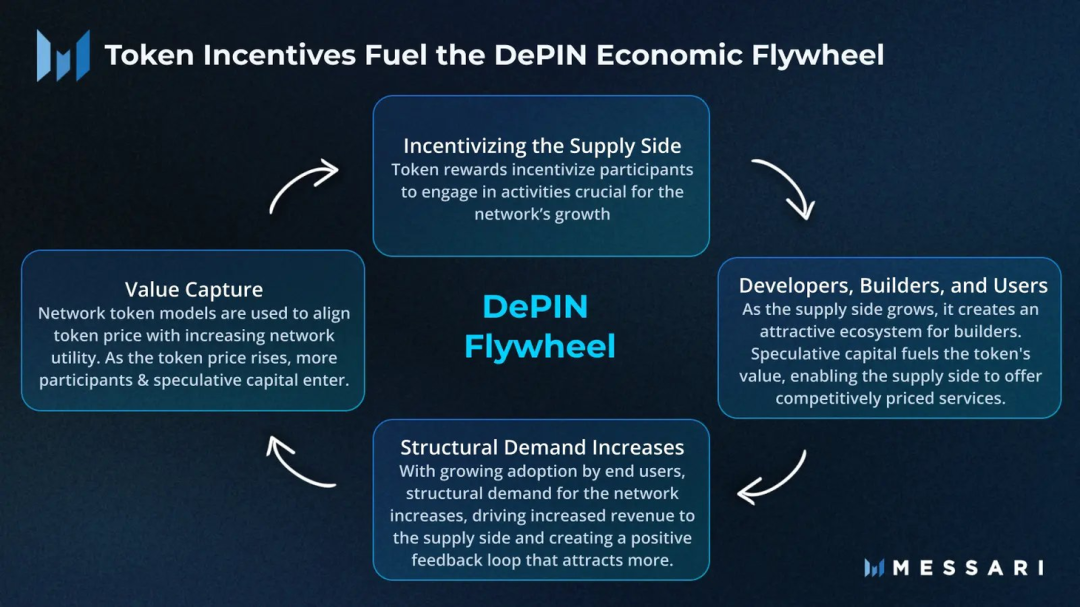 DePIN 是个完美适配 crypto 的赛道,是去中心化基础设施与区块链技术、代币经济的结合,区块链技术可以解决确权、验证等问题,而代币经济是激励更多参与者,构建网络效应的源泉。