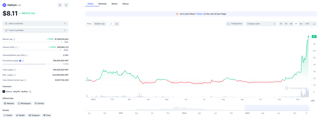 今年 Helium 发行了两个新的代币 $Mobile 和 $IOT,分别是 Helium Mobile 和 Helium IOT 两个 subDAO 治理代币,目的是实现治理的分离。Helium Mobile 的 5 G 热点业务赚取的是 $Mobile;而 $IOT 用于奖励专注于运行物联网的节点。$HNT 仍然是 Helium 生态系统中的主要资产,作为唯一能支付网络数据传输的代币。