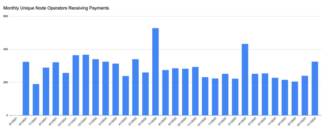 Render Network 的业务简单来说就是匹配算力和艺术渲染需求。算力供应角色称为节点运行者,这个数量一直保持稳定,目前有 326 个 Render 节点运行者在提供算力。