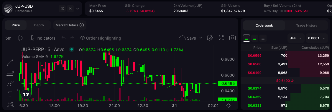 Aevo 数据显示,JUP 的 pre-lanuch 合约当前价格暂报 0.6455 美元,过去一个月内最高曾冲至 0.8464 美元,最低则曾跌至 0.2620 美元。