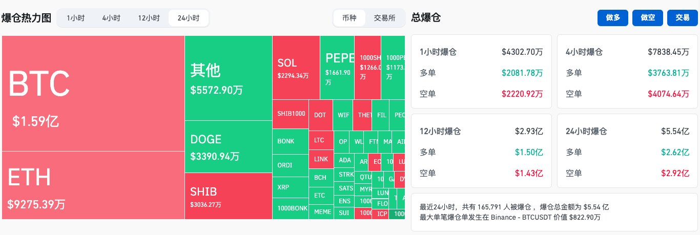 衍生品交易方面,Coinglass 数据显示,过去 24 小时全网爆仓 5.54 亿美元,其中空单爆仓 2.92 亿美元,多单爆仓 2.62 亿美元;BTC 爆仓 1.59 亿美元,ETH 爆仓 9275.39 万美元。