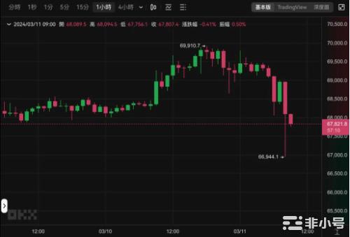 近12 个小时持续震荡走低,稍早约08:45,BTC 最低一度插针触及66,944,撰稿当下仍未站回6.8 万美元。