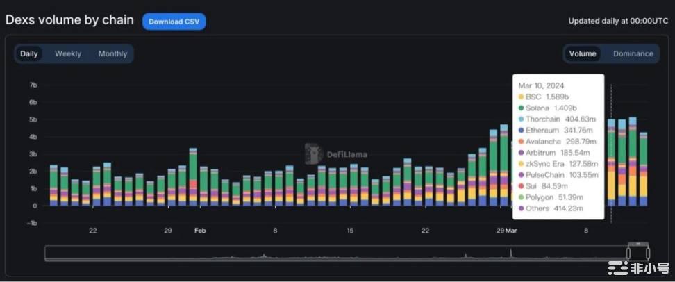 根据 DeFiLlama 数据,BSC 链上 DEX 3 月 10 日交易量超越以太坊链上 DEX,一举夺得头把交椅。