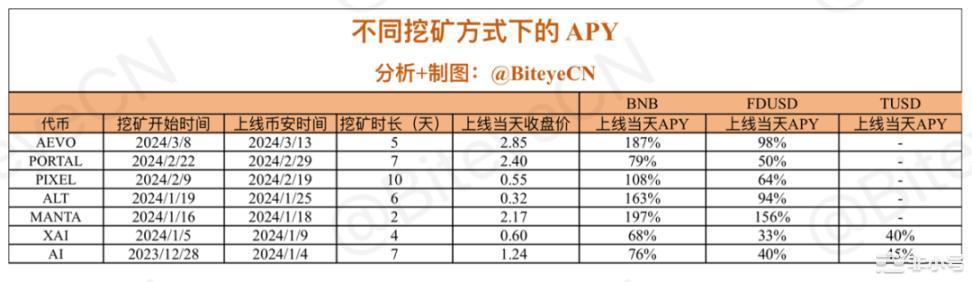 3、通过对比 3 种挖矿方式,计算上线价格表现带来的收益率,BNB 挖矿收益率远高于其他两种稳定币,几乎相当于两者相加。