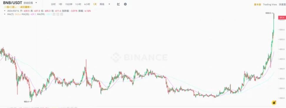 回顾上轮牛市,BNB 曾一度触及历史高点 690.93 USDT,随后在 2022 年至 2023 年期间经历了价格波动,维持 200-400 USDT 左右水平,目前它离历史最高价仅剩 9 %的差距。