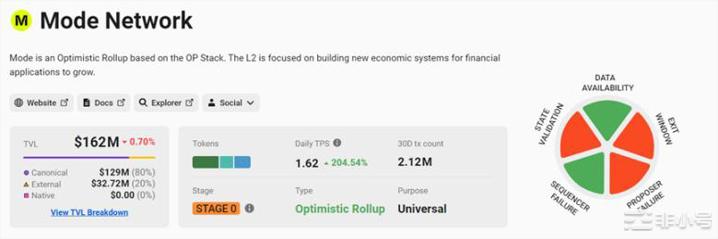 自主网上线以来 TVL 一直稳步增长,截至 2024 年 3 月 19 日在所有 Layer2 网络中 TVL 排名第 13,为 1.62 亿美元,日均 tps 为 1.62,GAS 中位数为 0.001Gwei,换算成实际花费小于 0.01 美元,过去三十日共发生过 212 万次交易。