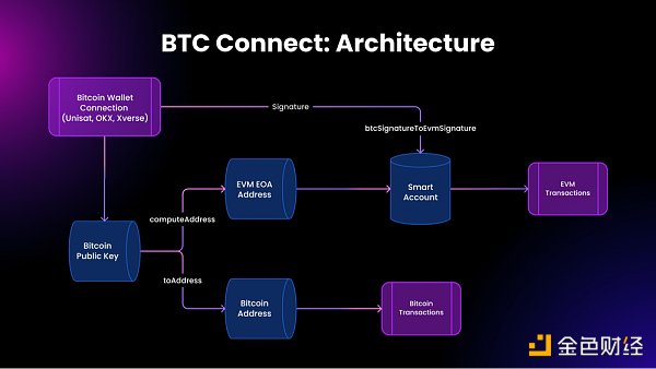 BTC Connect 通过统一用户的比特币账户和基于 EVM 的智能账户,在比特币上实现账户抽象。这是通过将比特币钱包作为比特币 L2 或 EVM 网络上智能帐户的签名者来实现的,使用户可使用现有的比特币钱包直接交互,无需额外的交互或界面。