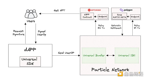 例如,如果给定用户在 Polygon 上拥有价值 1 ETH 的 MATIC ,但在 Optimism 上执行需要 1 ETH的交易,则粒子网络将通过为其预期交互提供的初始签名来路由和执行跨链交易。这使得价值能够快速从 Polygon 转移到 Optimism,从而用于相关的行动,从而创造出跨越所有区块链的单一平衡的感觉。