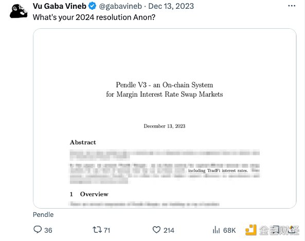 根据联合创始人 Vu Nguyen 发布的推特,Pendle 的 V3 版本计划在 2024 年推出,其包含了传统金融的利率衍生品,这将引起 tradeFi 的极大兴趣。具体的实现细节暂时未知。