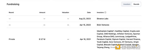 该项目的主要投资人包括 Mechanism capital、HashKey、Bixin Ventures、Binance Labs 等。