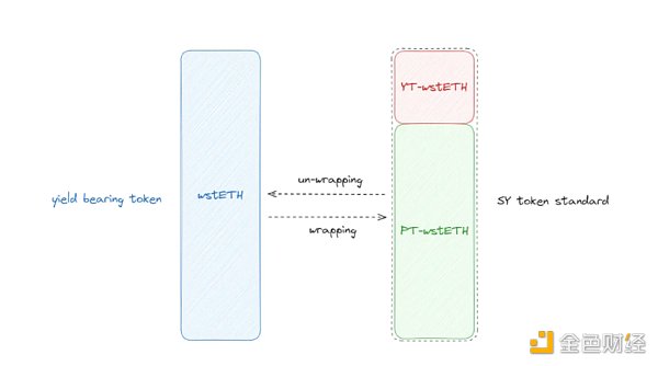 Pendle 创新性的将收益资产代币化成 SY 代币,其根据 ERC-5115: SY Token 标准进行的代币化,如将 stETH 包装成 SY-stETH,之后 SY 被分为其本金和收益成分,分别为 PT(Principal Token,本金代币)与 YT(Yield Token,收益代币)。