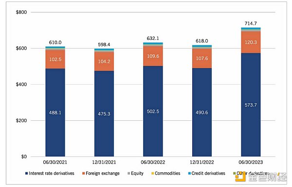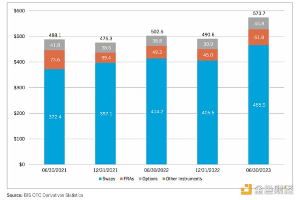 在 TradeFi 中,利率衍生品是在衍生品市场中占据市场大部分的头寸。并且,随着 TradeFi 的发展,衍生品市场的整体规模也在逐渐增大,截止 2023 年 6 月,整体衍生品市场的头寸已经达到了 714.7 万亿美元,而其中利率衍生品未平仓头寸达到了 573.7 万亿美元,占据了 80.2% 的份额。