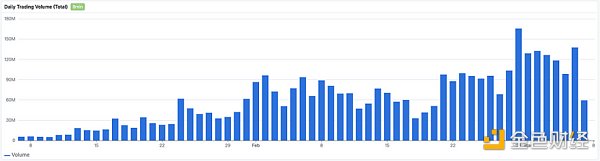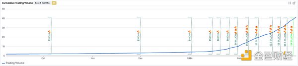 在 Pendle 协议上的交易笔数、交易量也呈现非常正向的逐渐增高,这意味着市场随着 LSD、LSDFI、LRT、Restaking 等 DEFI 项目的发展,市场对于利率衍生品的需求逐渐增加。并且截止于 2024 年 3 月 7 日,其累计交易量也突破 40 亿美元,并且其趋势是逐渐增多。
