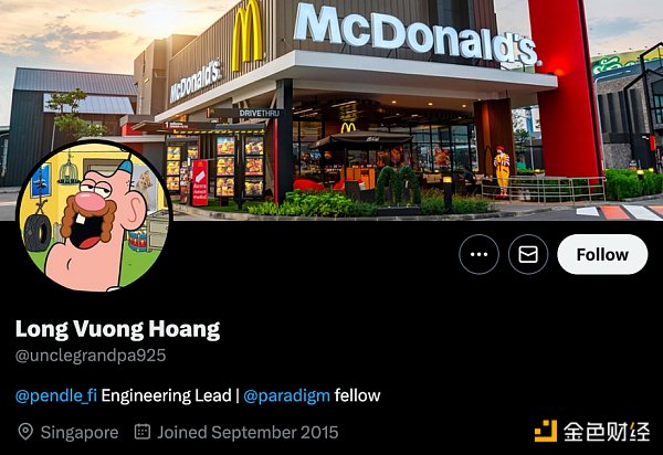 Long Vuong Hoang(X: @unclegrandpa925):工程主管,获得新加坡国立大学计算机学士学位,在 2020 年 1 月加入新加坡国立大学担任助教,在 2021 年 5 月加入 Jump Trading 担任软件工程实习生,在 2021 年 1 月加入 Pendle 担任智能合约工程师,后在 2022 年 12 月升职为工程主管。