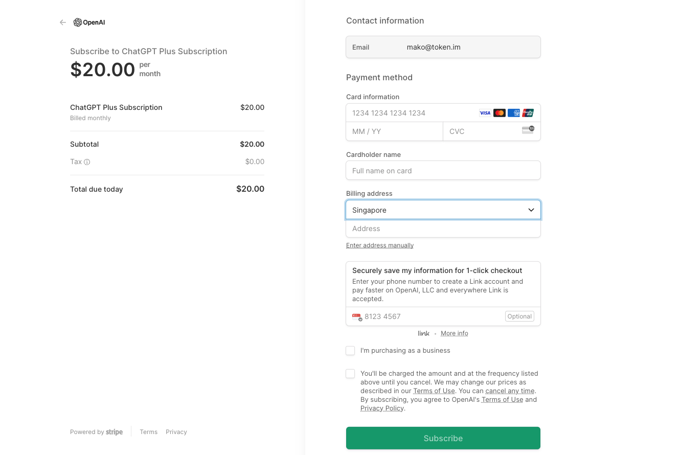 3. 输入 imToken Card 信用卡信息和账单地址,点击「Subscribe」完成订阅