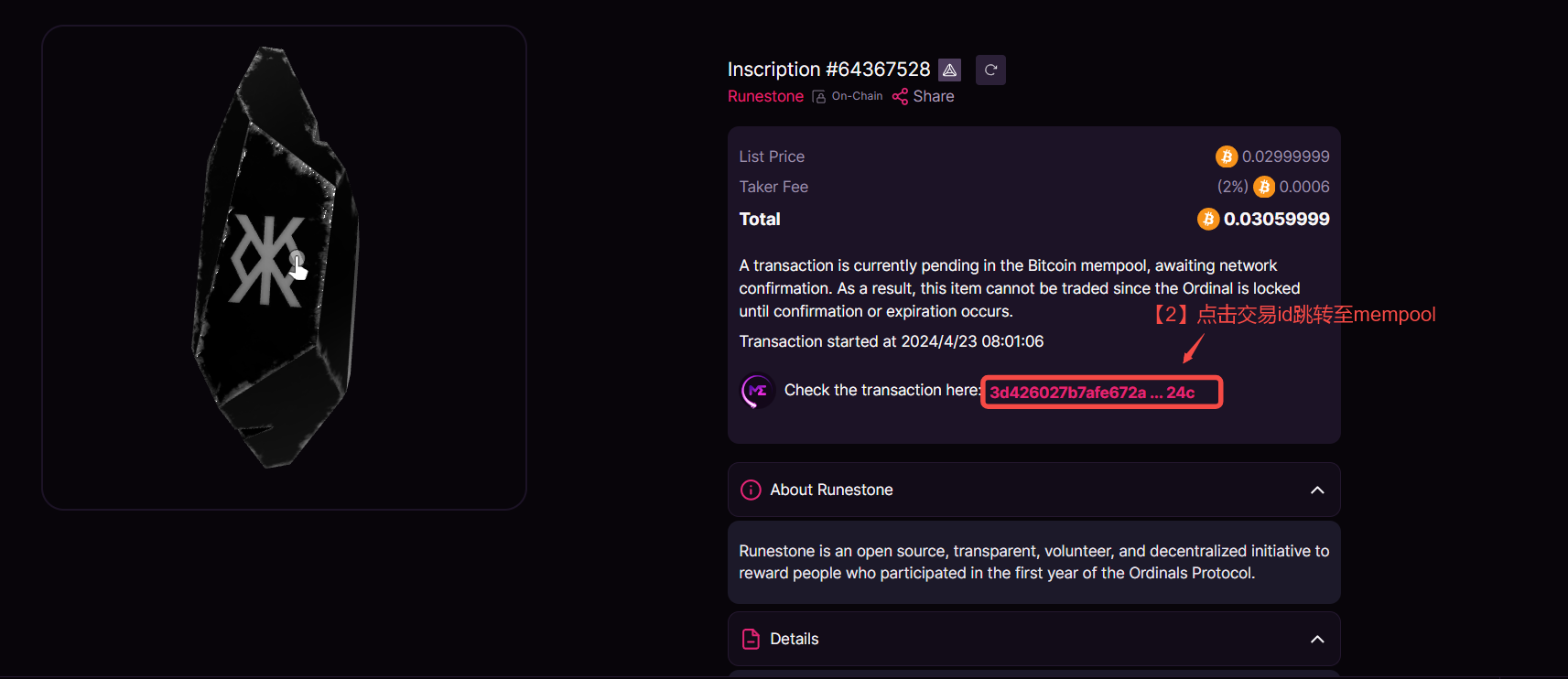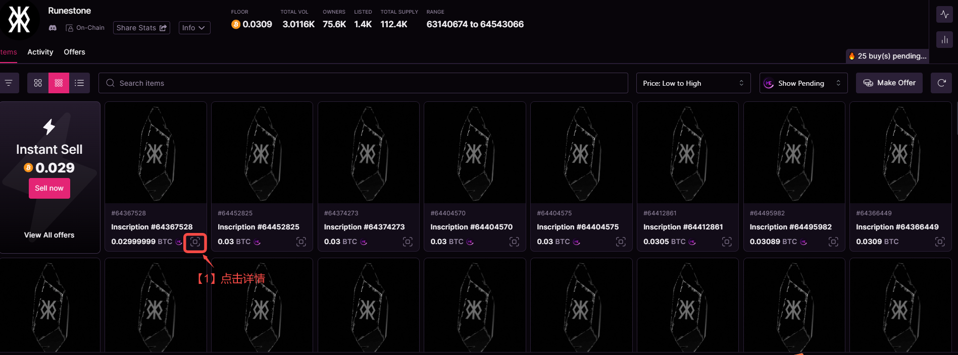 以 Magic Eden 为例,如果我们现在想要狙击 Runestone 的交易,首先打开 Runestone 的交易界面,点击详情