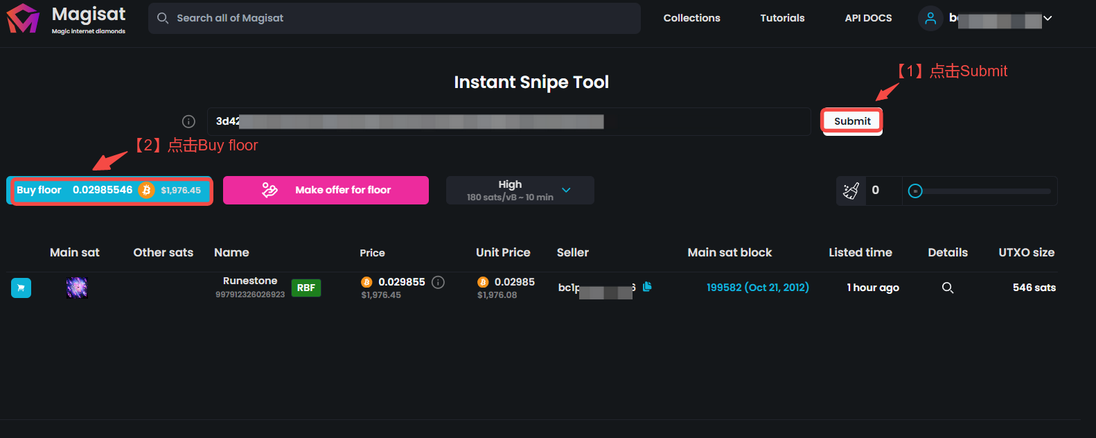 然后将刚刚复制的交易 id 粘贴到搜索框,先点击“Submit”,可以看见下方已经出现了该笔交易的详细信息,然后我们再点击“Buy floor”