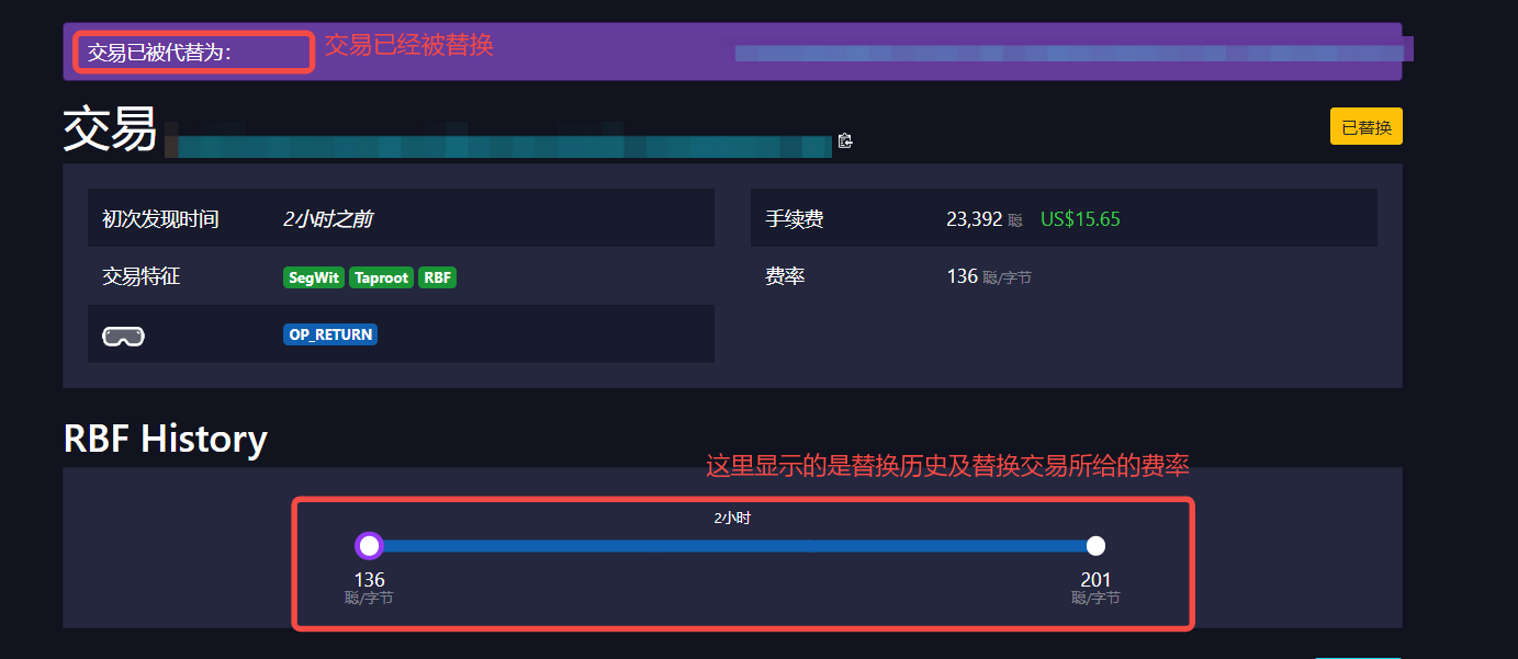 此时如果返回 mempool 中查看原交易,如下图,会显示该交易已经被代替为新交易,并且下方还展示了代替交易的历史。