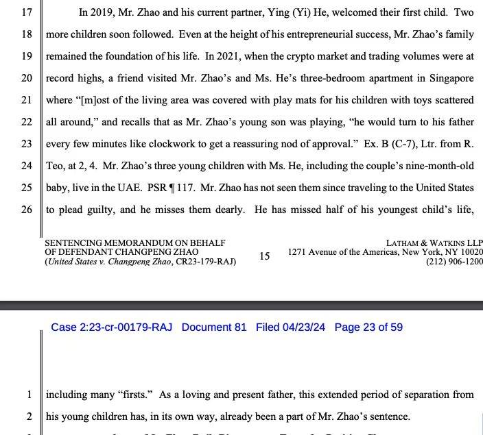 现在,赵长鹏与何一的三个年幼的孩子(其中一个仅有 9 个月大)都住在阿联酋,赵长鹏到美国认罪后就再也没有见过他们,也非常想念他们。赵长鹏律师团队在量刑备忘录中称,赵长鹏已经错过了他最小孩子生命的一半时光,“作为一个充满爱心的父亲,这种与年幼孩子长期分离状况,已经成为赵长鹏生活的一部分。”