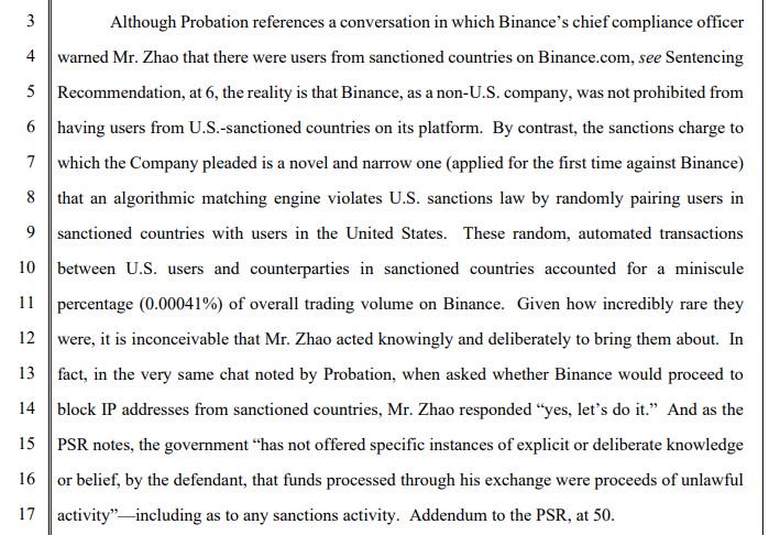 更重要的是,赵长鹏律师团队的量刑备忘录中提到:“币安是一家非美国公司,因此对币安提出制裁指控是一项狭隘的指控(首次针对币安)。虽然算法匹配引擎将受制裁国家的用户与美国的用户随机配对,违反了美国制裁法,美国用户与受制裁国家的交易对手之间的这些随机、自动交易仅占币安总交易量的很小一部分(0.00041% ),鉴于此,指控赵长鹏故意为之十分牵强。事实上,币安一直在屏蔽来自受制裁国家的 IP 地址。”