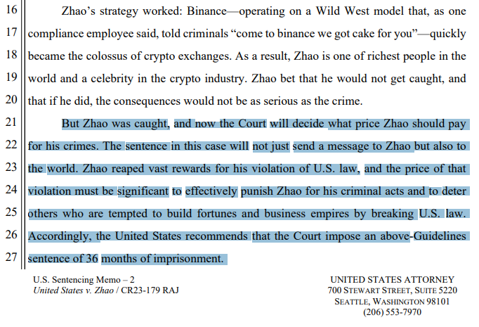 “此案的判决不仅向赵长鹏发出一个信号,也是在向全世界发出一个信号,赵长鹏违反美国法律而获得巨额回报,这种违法行为的代价必须是巨大的,才能有效惩罚赵的犯罪行为,并阻止其他试图通过违反美国法律来建立财富和商业帝国的人。因此,建议法院判处高于准则的 36 个月监禁。”