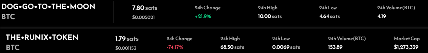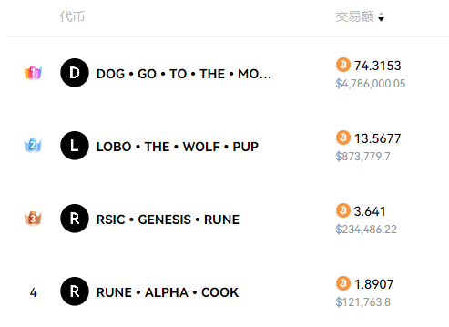 那么低廉的网络费用是否能带来 RuneChain 的大规模使用?从官方展示数据来看,在 RuneChain 的交易量最高的 RUNIX 24 小时交易量高达 153.89 BTC,当前主网上最热门的 DOG 符文也高达 4.19 BTC。