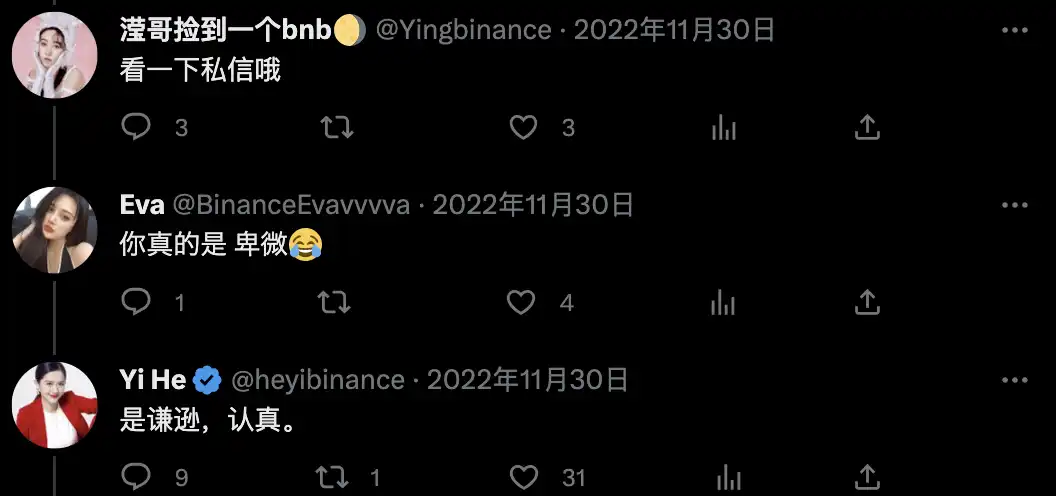 而这已经不是她今年第一次频繁在社群露面了。去年 5 月,币安因为 Launchpad 上线项目质量和表现不佳而遭到社区的猛烈抨击,「闺蜜币」、「没认知」等字眼几乎在每一条与币安相关的推文中都能找到。在这段时间里,还是何一,从大清晨到晚上一两点,对每一条推文做回复,有的甚至直接「在线 Battle」。