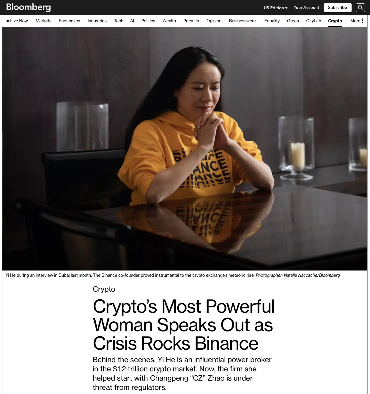 当天,彭博社发表了一篇对何一的专访文章,这是西方主流财经媒体第一次以一篇完整稿件的篇幅报道这位百亿独角兽背后的女性,中文媒体纷纷编译并转发。专访文章标题《加密领域最有权力的女人,在币安危机时刻发声》,人们仔细阅读后发现,彭博社似乎并不认可这位「币安女强人」在币圈所拥有和展现出的「超能力」。