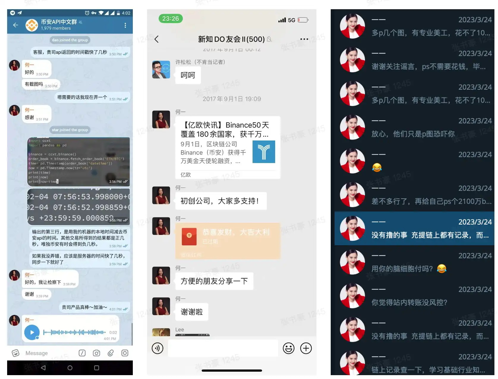 在币安转战海外后,何一成了币安与中文社区最稳固的桥梁。不管在哪里,什么时间,你都能够找到她。在用户眼里,何一是币安的「首席客服」,对消息的反应最迅速,夜深常活跃于各类在微信群,币安只要一有活动,她一定亲自在群里发红包请大家转发。在路人眼里,何一是币安的「救火队长」,以前是冲在一线和竞品厮杀,如今是第一时间出现在币安的各种 FUD 现场辟谣。