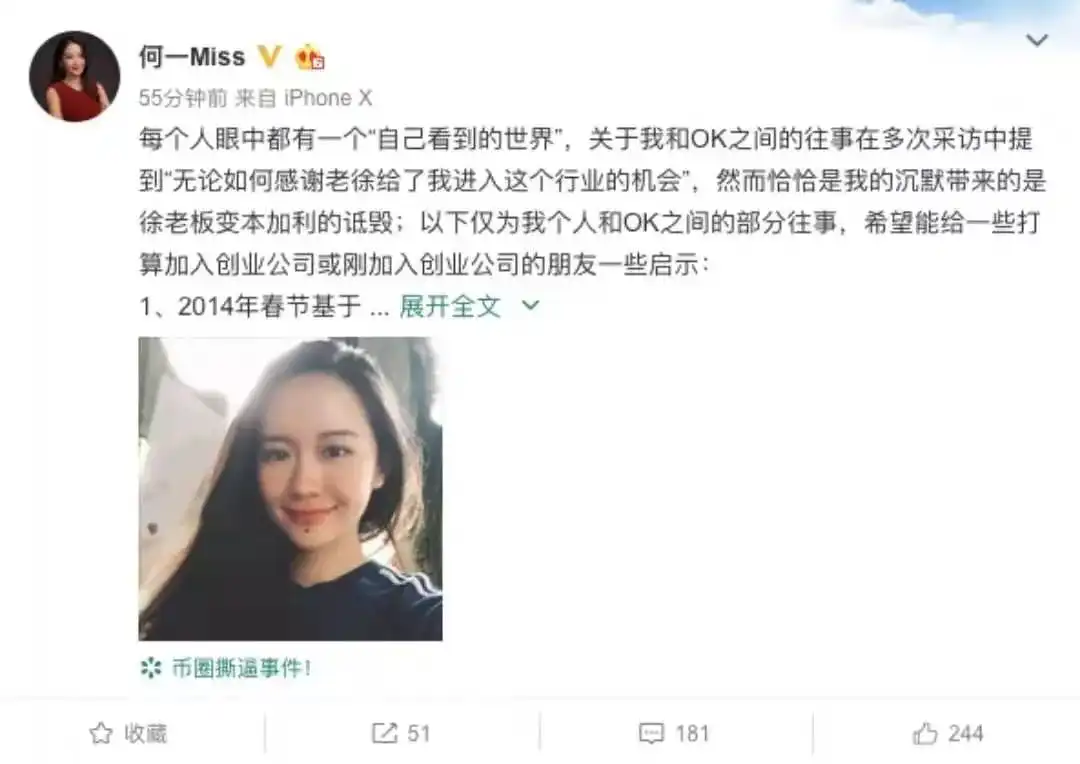 业务上的短兵相接,很快催生了友商之间的「口水战」。10 月,徐明星突然和昔日战友何一撕了起来,发微博称何一与 CZ 在公司内部谈恋爱,缺乏职业道德和合伙人精神。而彼时的 CZ 已是已婚人士,何一很快否认了和 CZ 的恋爱关系并做出反击。