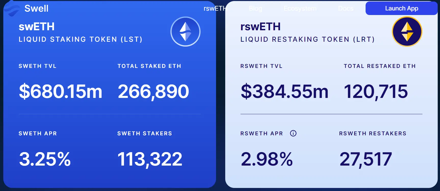 Swell 同样也是以太坊上的流动性质押协议 LST,用户可以质押 ETH 获得 LST 流动质押凭证 swETH。今年 1 月宣布推出基于基于 EigenLayer 的再质押服务 LRT 产品 rswETH。