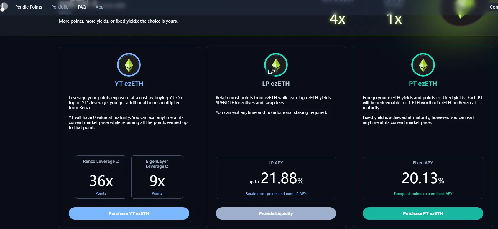 此外,Pendle Finance 还向持有 ezETH 的 YT 代币(YT-ezETH)的用户分配 EigenLayer 积分和 Renzo 积分。