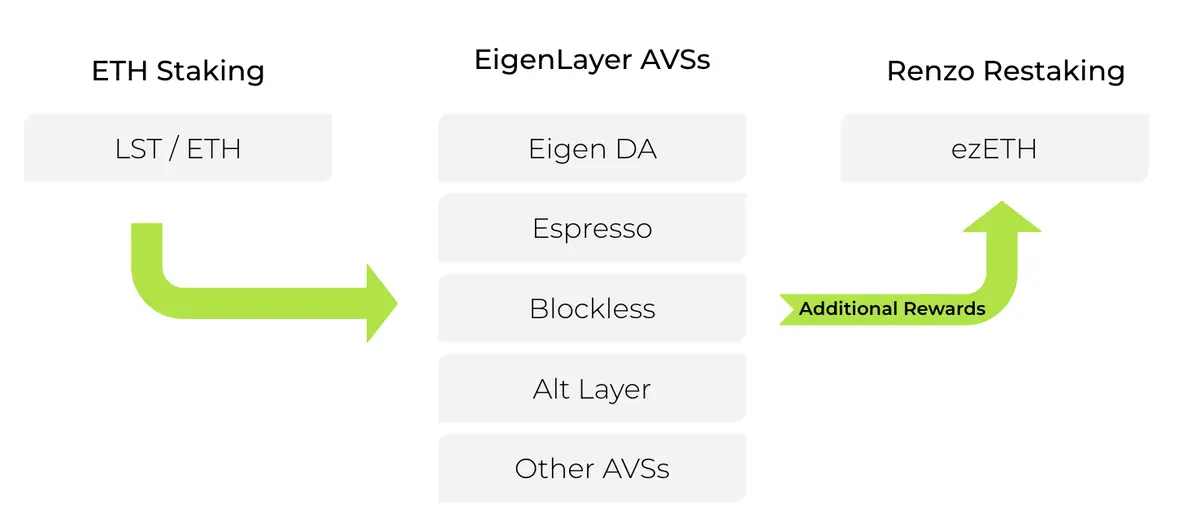 用户只需将其 ETH 和 LST 资产存放在 Renzo 平台,会收到再质押凭证 ezETH,持有 ezETH 就可获得以太坊 PoS 质押收益和其它 AVS 节点服务收益。