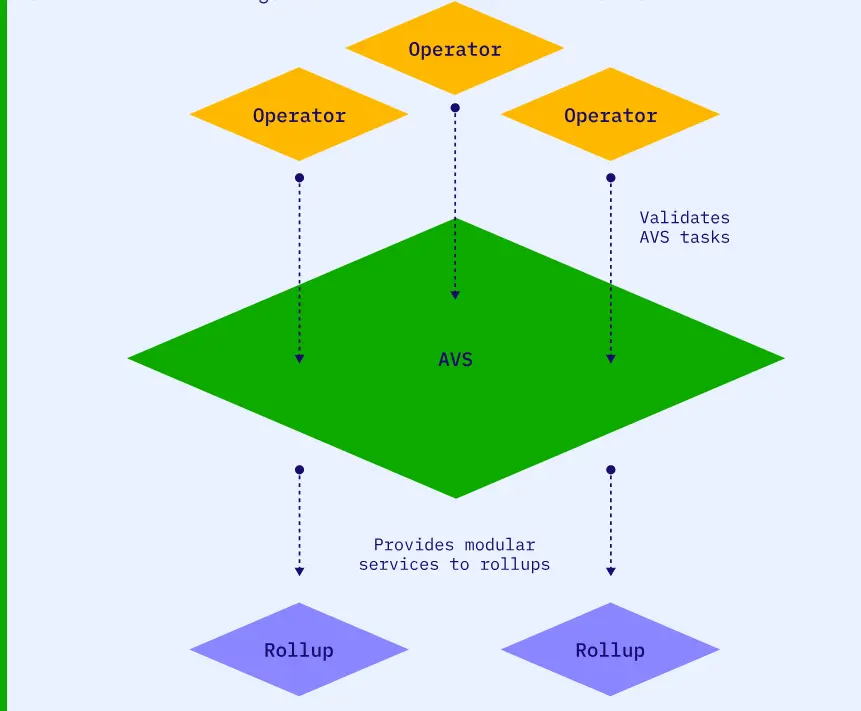 其中,节点服务方案 AVS 全称 Actively Validated Services(主动验证服务),是 EigenLayer 的核心理念,是为区块网络或 DApp 项目方提供安全和去中心化保障的节点服务方案及系统。用户可以将其视为是一个中间件,通过它连接以太坊质押者或 LST 资产持有者和有节点服务需求的项目方,为项目方提供节点运营及验证服务,然后从项目方提供的节点奖励和手续费中抽取收益。