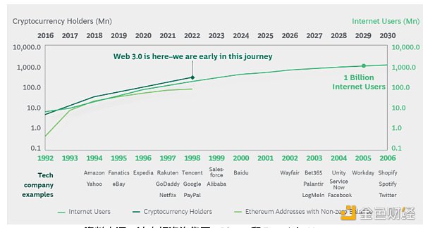 报告比较了互联网和加密货币用户数达到10亿人的曲线,并假设当前的加密货币采用率保持稳定。