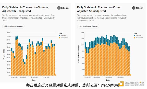 虽然 4 月份稳定币交易的总量达到 22 亿美元,但 Visa 与 Allium Labs 合作将不到 10%(149 亿美元)归类为真实交易,其余归因于机器人活动和内部交易所运营。根据 Visa 的仪表板,此调整指标旨在消除“非有机活动和其他人工通胀做法”。