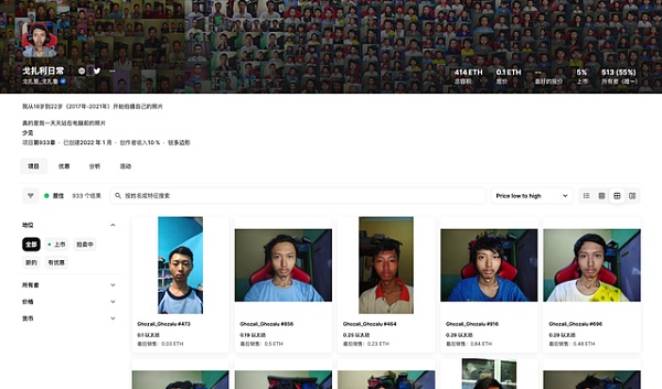 直到NFT开始走红,Ghozali才萌生了一个想法:如果把这些平凡的自拍做成NFT出售,会有什么有趣的事情发生?于是,他将这些自拍整理成一个名为"Ghozali Everyday"的系列,放到NFT交易平台OpenSea上,定价仅仅是0.00001ETH(约3美元)。"因为我从来没想过会有人想买这些。"Ghozali后来解释道。