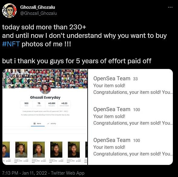 类似的故事也发生在2022年1月,一位名叫Ghozali的22岁印尼大学生,仅仅通过出售自己的自拍NFT,就赚得了100万美元(约合720万人民币)。