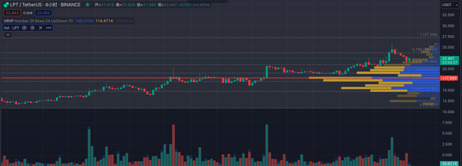 2、近期日线级别上,在筹码上有明显链上地址建仓,价格形态符合斐波那契的关键位置,量价关系上买方强于卖方。