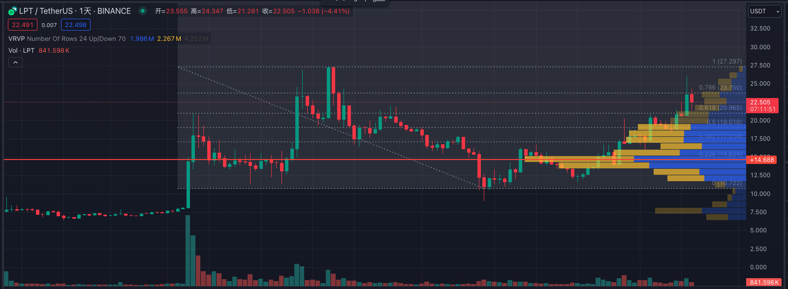 自 3 月高点下跌后形成新的支撑,第一密集成交区在 14.5 ,其次是 17 – 19 ;技术形态符合斐波那契的关键点位,当前站稳 21 (0.618)上方