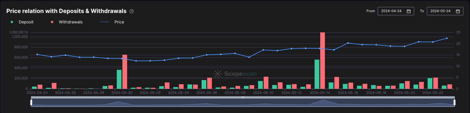 链上数据在近 30 天新出现了大额提币的流动,根据 Scopescan 数据, 5.14 日大额提币 108 w 枚,cex 净流出 50 w 枚左右。参考 Nansen 数据,前 20 持仓在近 30 日新增三个大户地址,合计 95 w 枚左右,除三方托管地址外,其余非交易所链上地址流出较少。