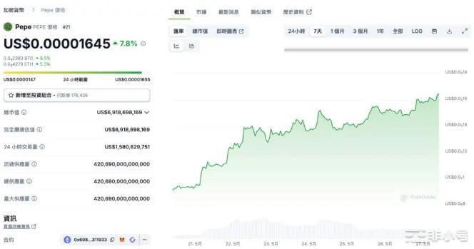 PEPE冲破0.000016美元再创新高,市值成第21大代币