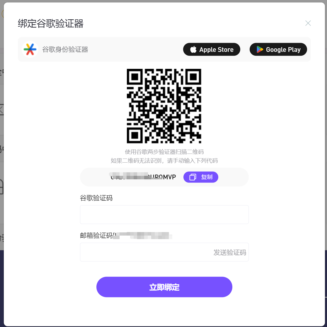 将随机生成的6为数验证码回填至COINW绑定谷歌界面,点击“立即绑定”,即可绑定成功