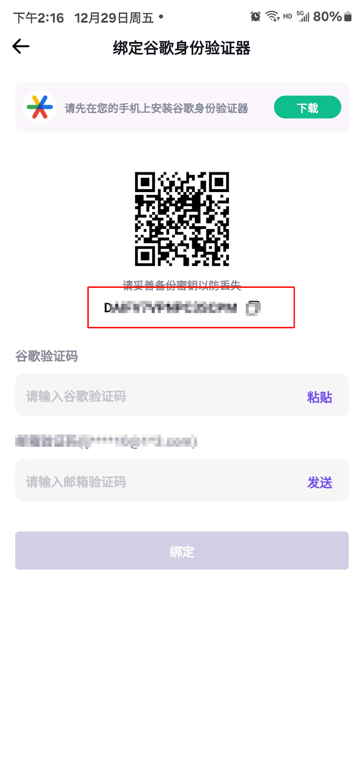 在绑定界面会出现一段秘钥,复制此秘钥