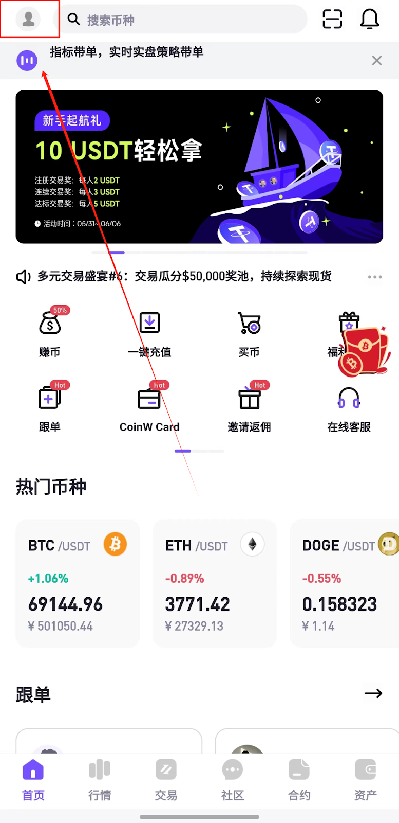 1、打开CoinW APP,进入首页,点击左上角账户图标,进入安全中心;