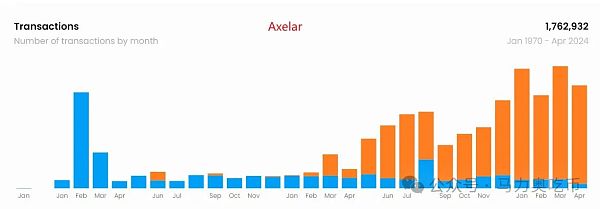Axelar从去年9月的5.9万/月信息一直增加到三月的17万/月。这个数据体现出Axelar比较真实的数据,也能反映了在行情火热的时候,跨链的需求也会同步的增加。