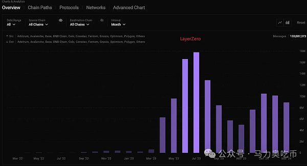 虽然LayerZero的跨链信息是其它两个的几十倍,但是我认为主要贡献来自撸毛党的交互,LayerZero是唯一一个没有发币的,它是撸毛党必参与的一个项目。一旦上线后,其真实的用户尚未可知。而从变化趋势来看,LayerZero今年的跨链信息数量比去年有所降低。今年3月的月数据不到去年最高峰的50%。